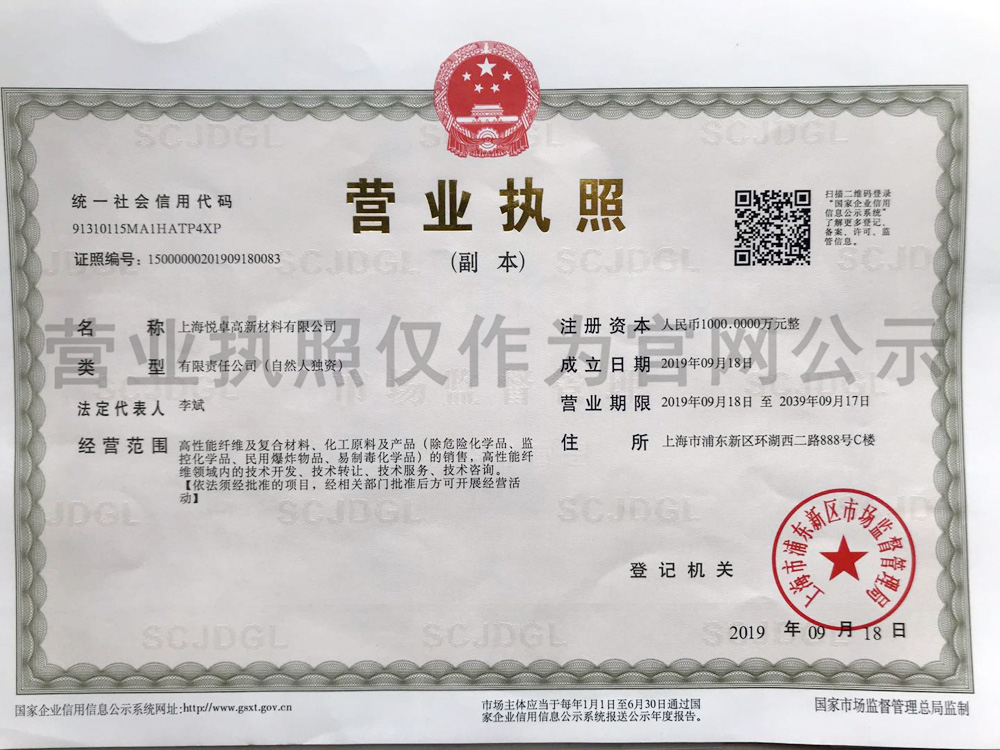 135-2458-9997上海悦卓高新材料有限公司成立于2019年,是一家集研发、生产于一体的高科技企业,公司人员在高性能纤维,纤维织造及织物加工方面均有20年以上的相关经验。技术力量雄厚、检测设备齐全。公司产品主要分为高性能纤维,高性能纤维织物,纤维织物后加工等产品。用途范围包括:耐高温(550°--1500°),高强度(高强玻纤,高强聚芳酯纤维,UHMWPE纤维)。产品广泛用于电线电缆,阻燃防火布,高强度纱线,工业胶带,体育器材,轨道交通航空复材等方面。公司创建初期,即以做优质的高端材料供应商为目标,积极配合下游客户不断开发特殊规格及要求的产品。产品目前已通过多方面认证,所有产品均不含各项有害物质,